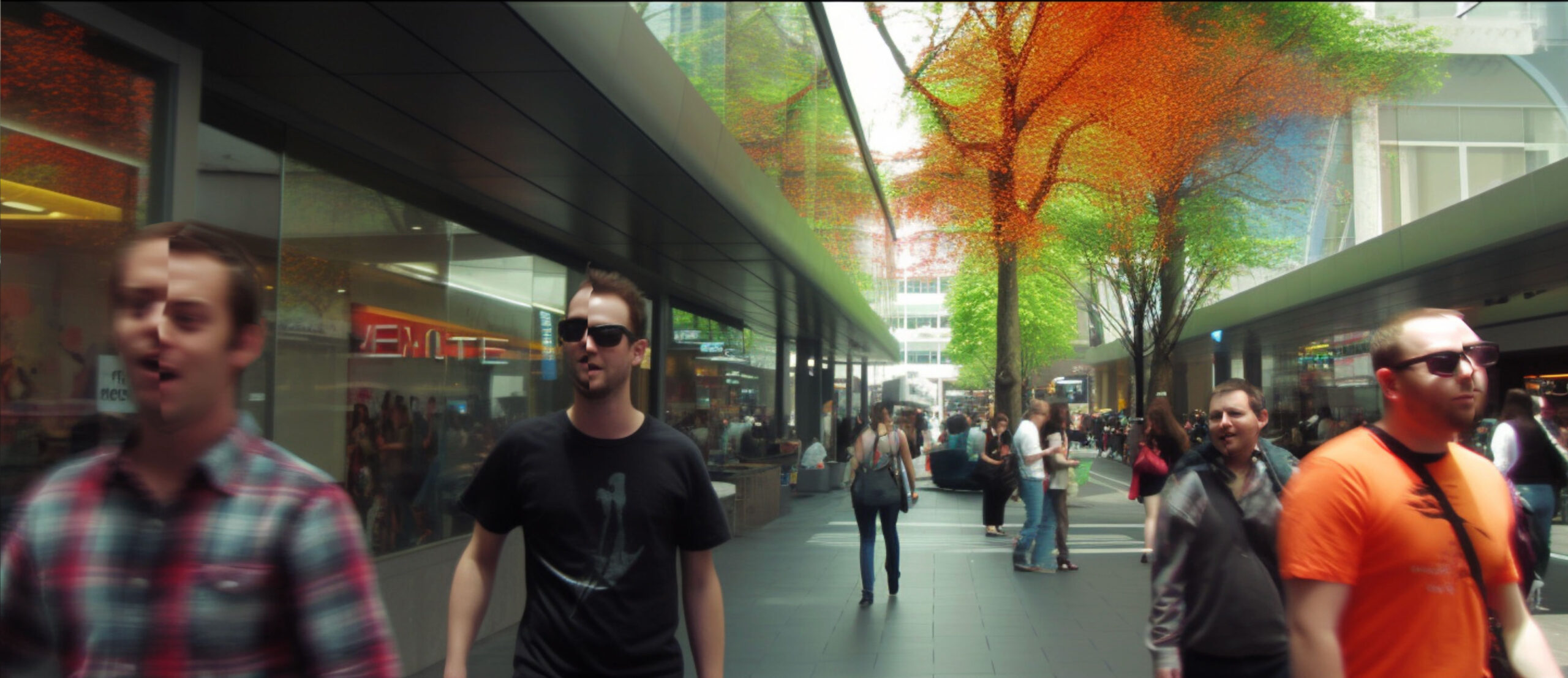 This is the recreated view behind me on the road. I was driving to an appointment. Going to change lanes I first check behind me in the rear view mirror and all was clear. I then do the second check by turning my head over my shoulder. The building on the side of the road morphs and changes – at first palinopsia style, dragging across the road – then turning into a large truck!. This truck was right up behind me in the lane I was going to change into. This is quite confronting, frightening to have happen. (movie 2020)Palinopsia, or trailing of images was a daily and persistent occurrence. My medical specialists were concerned that this visual symptom may have been caused by medications I had been prescribed. This led to many explorations over the years. (movie 2020)I look out my back door, up at the sky and see the clouds rolling in. A big stormy sky is forming. First thoughts are I better go and close all the windows as any minute now the rain will start. As I am back inside I realise it does not feel at all like rain is in the air. Looking out other windows there is no sign of a storm rolling over, from any direction. To confirm I return to the back door, and it is a beautiful clear and starry sky. (movie 2020)